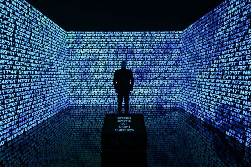 Inspired by an interest in how geography and navigation shape human experiences, Mohammed incorporates coordinates and animations of waves into the work, challenging the notion of fixed borders and encouraging viewers to reflect on Dubai’s interconnected landscape.